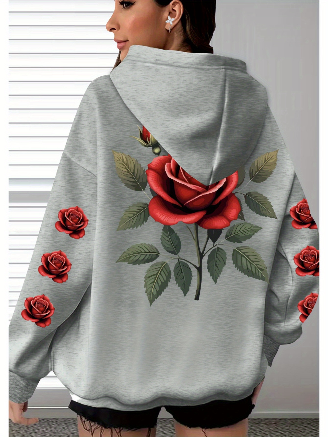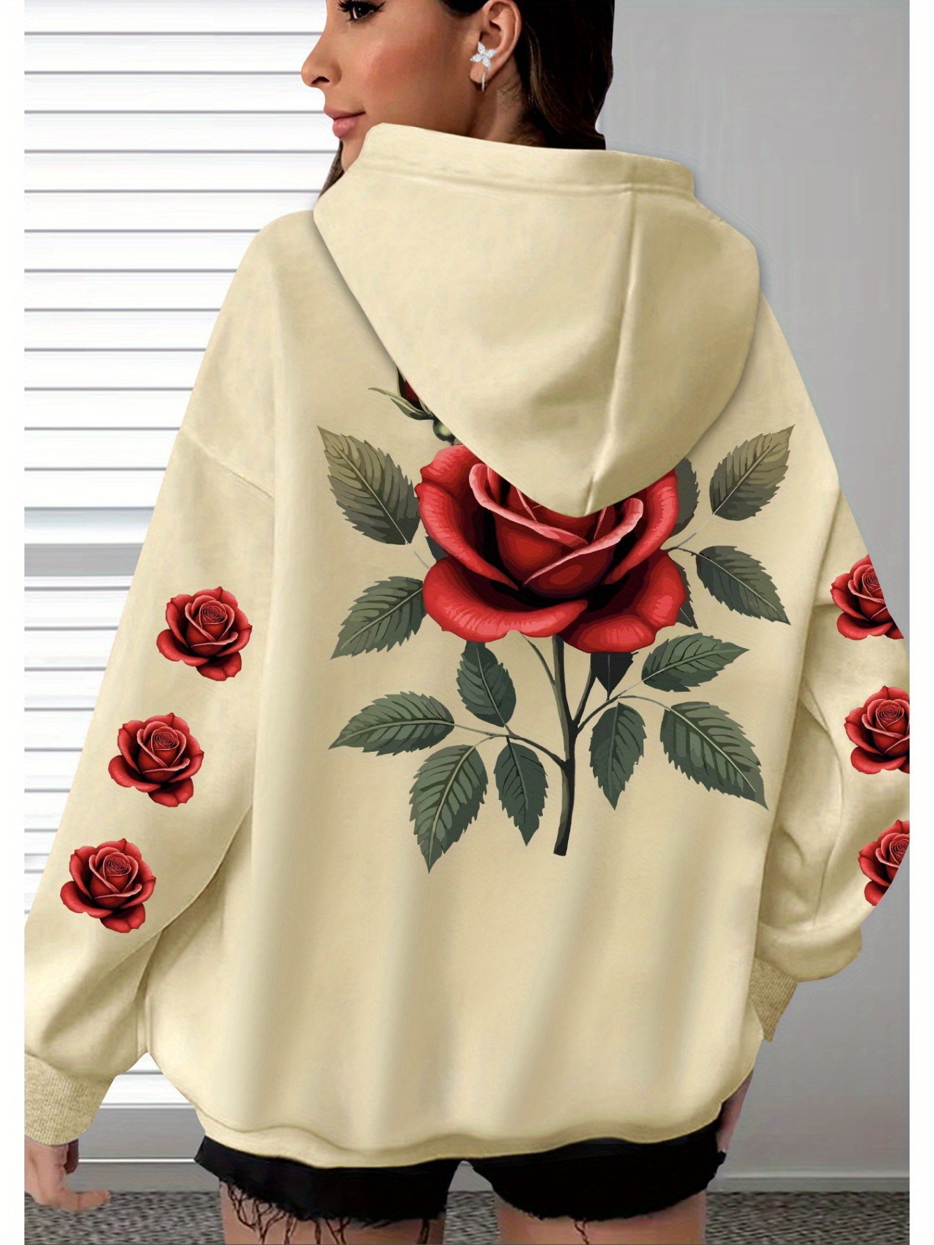 [Floral Print Hoodie] Women's Plus Size Floral Print Hoodie - Cozy Long Sleeve Pullover with Pockets, Soft Casual Wear, Brown with Red Roses and Green Leaves Design, Allseason Hoodie | Stylish Casualwear | Comfortable Fabri