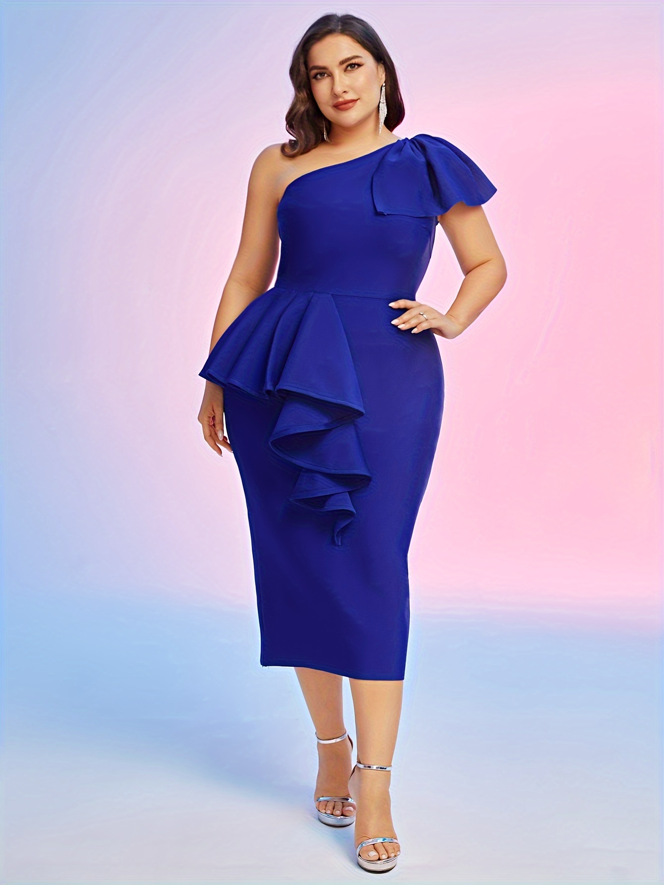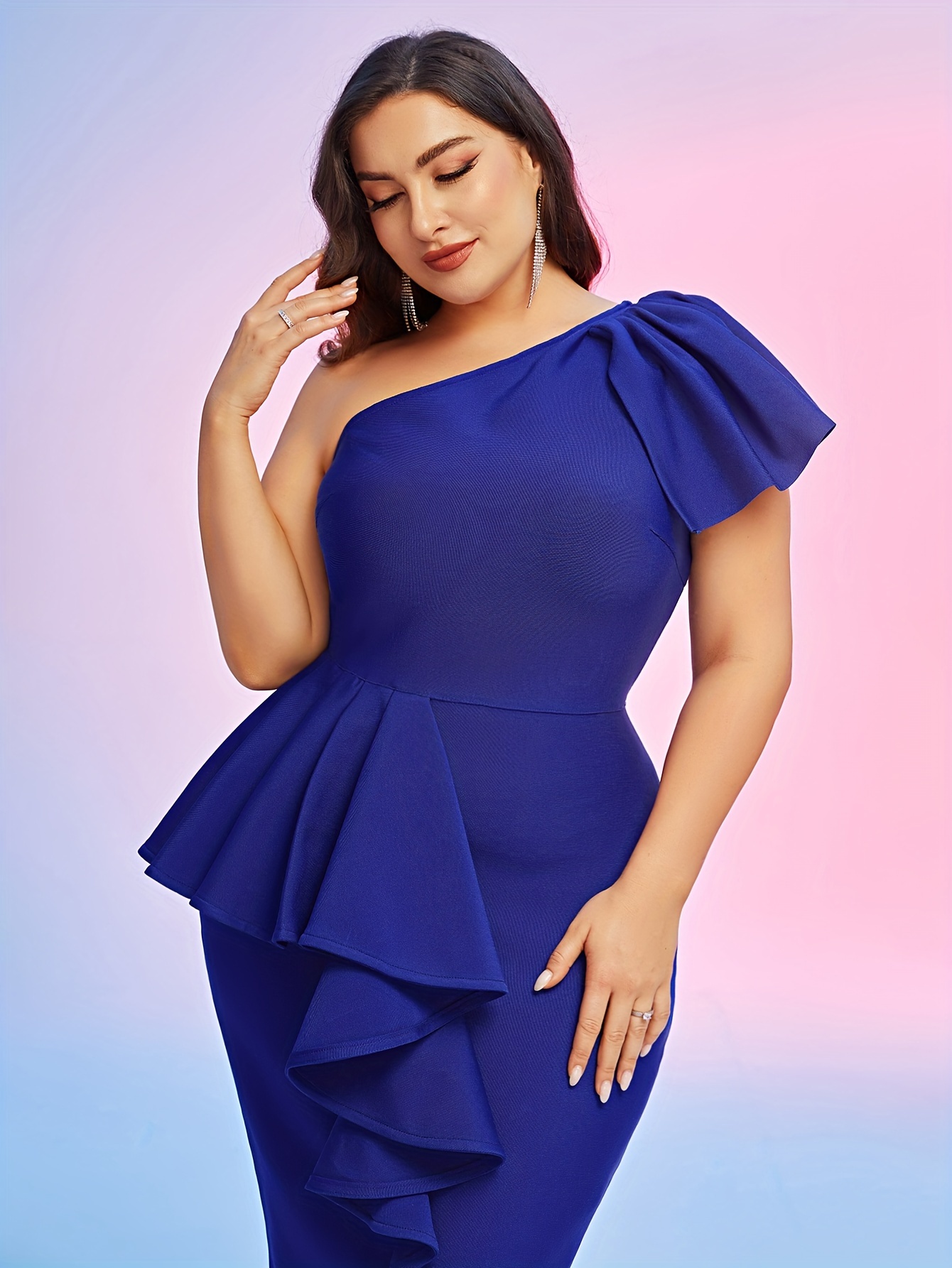 Plus Size One Shoulder Ruffle Trim Dress, Casual Short Sleeve Bodycon Dress, Women's Plus Size Clothing