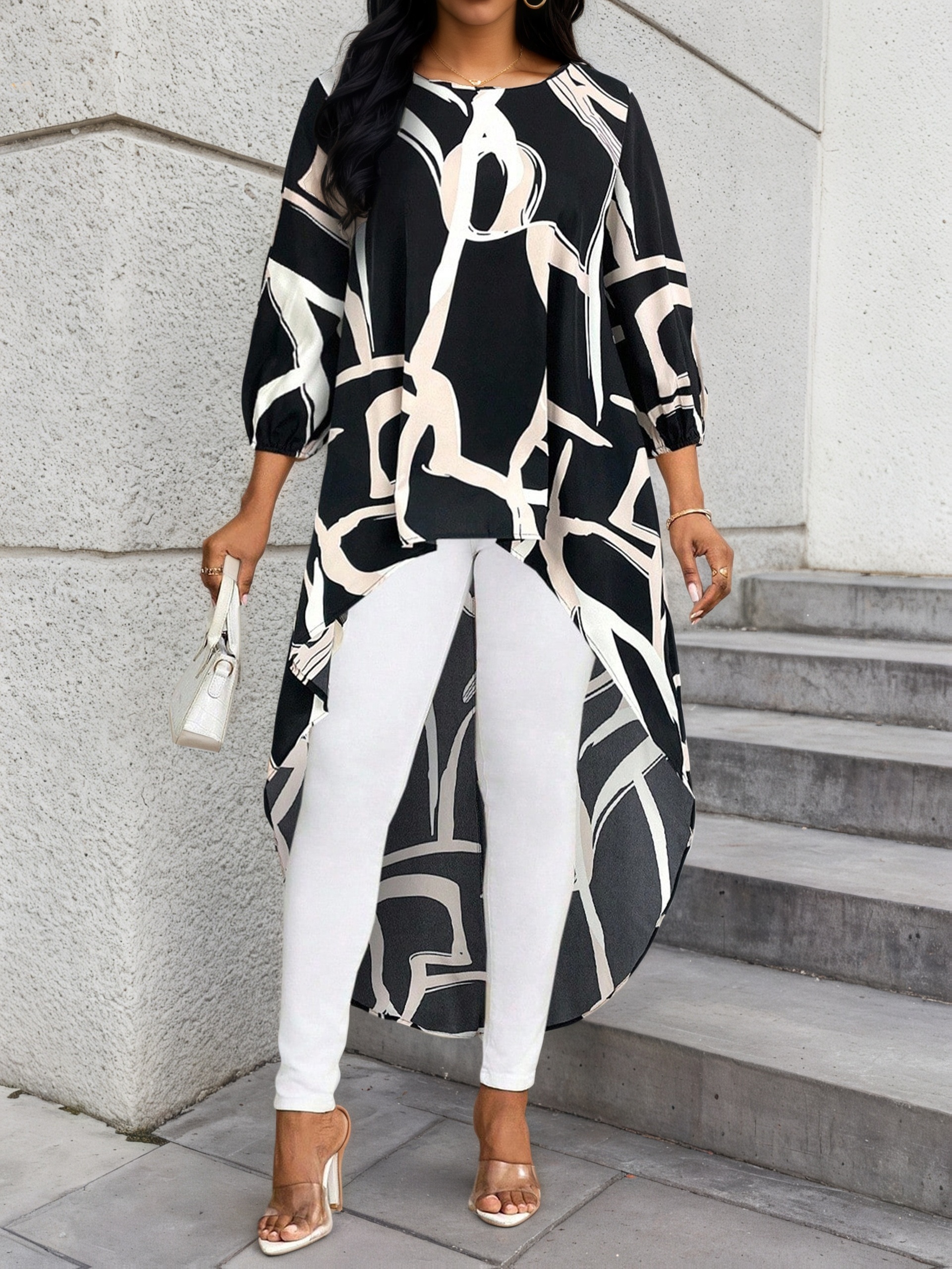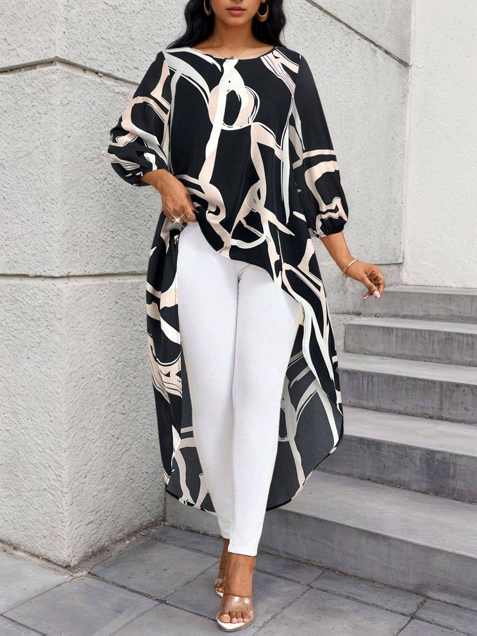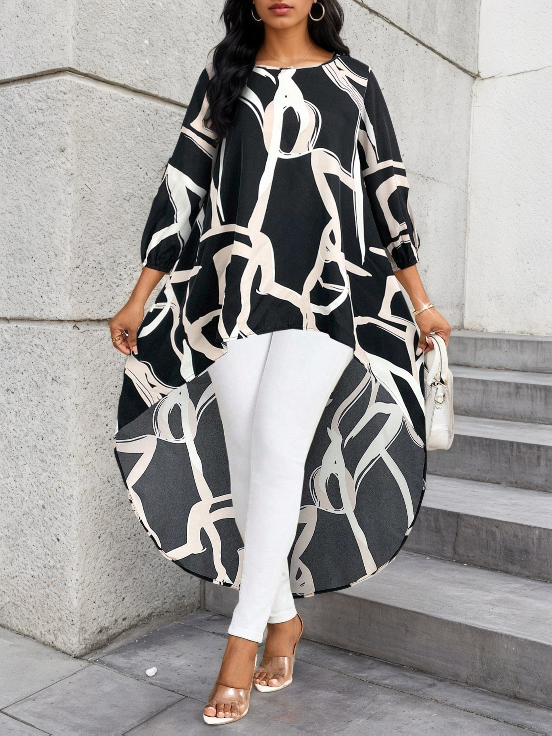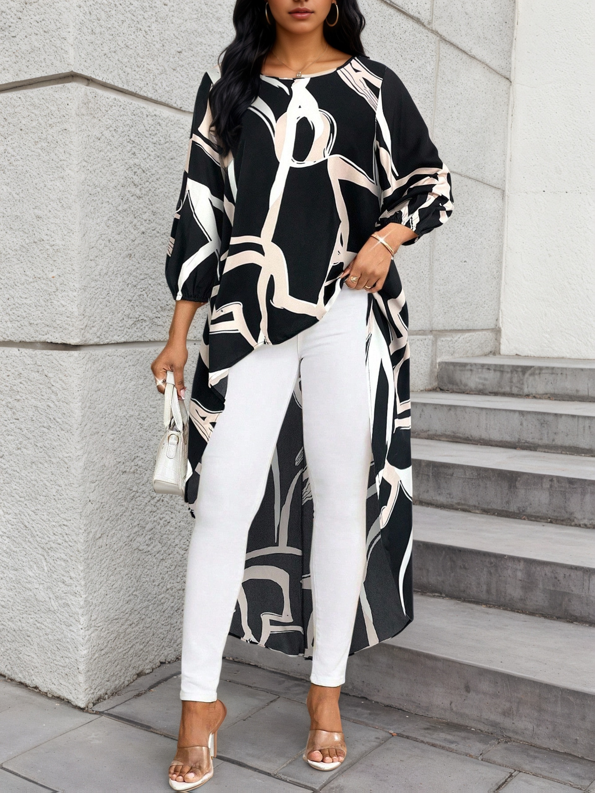 Plus Size, Plus Size Women's Elegant Oversized Asymmetrical Hem Blazer-like Jacket - Black/White/Beige/ Geometric Print Long Sleeve Coat, Machine Washable Loose-Fit Top for Spring/Fall, Casual & Formal Events (No Chest Padding)