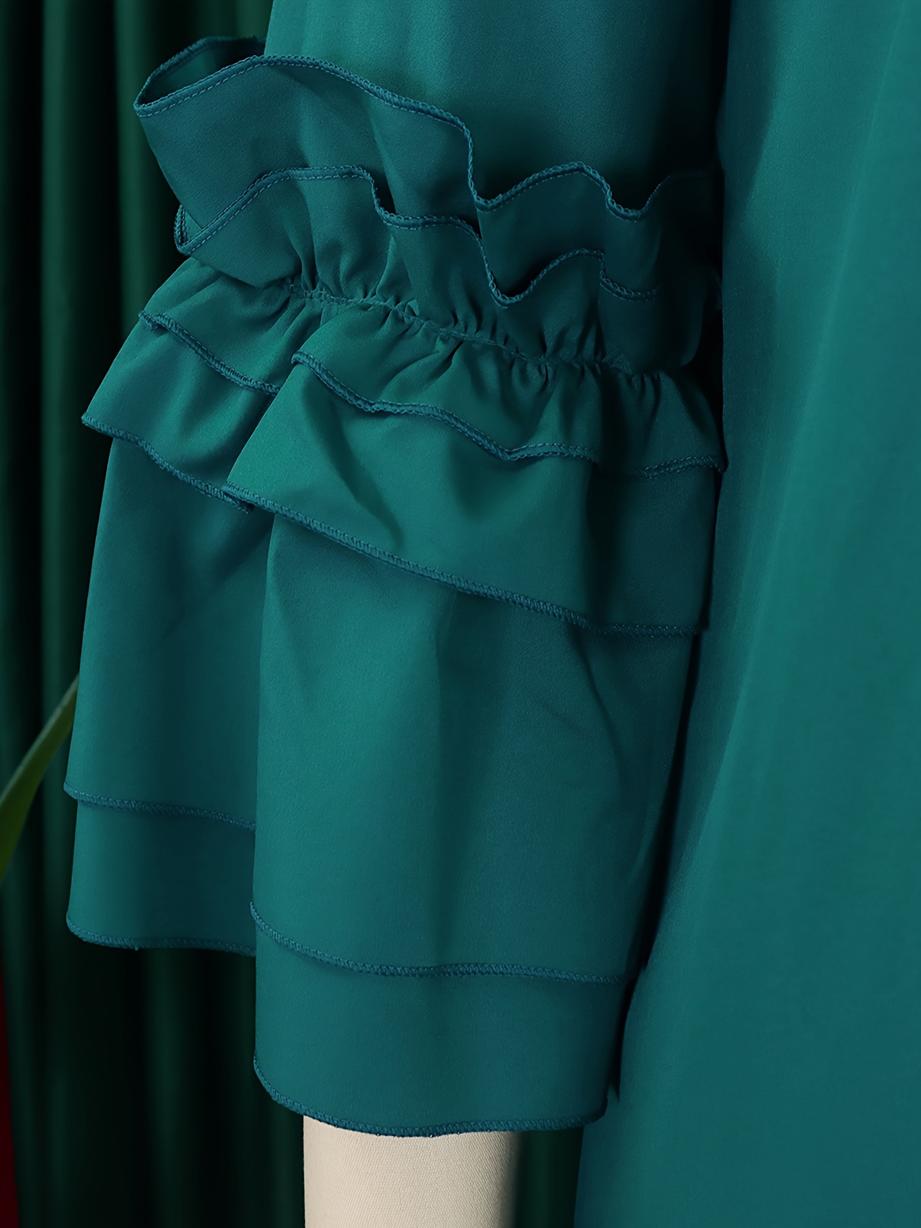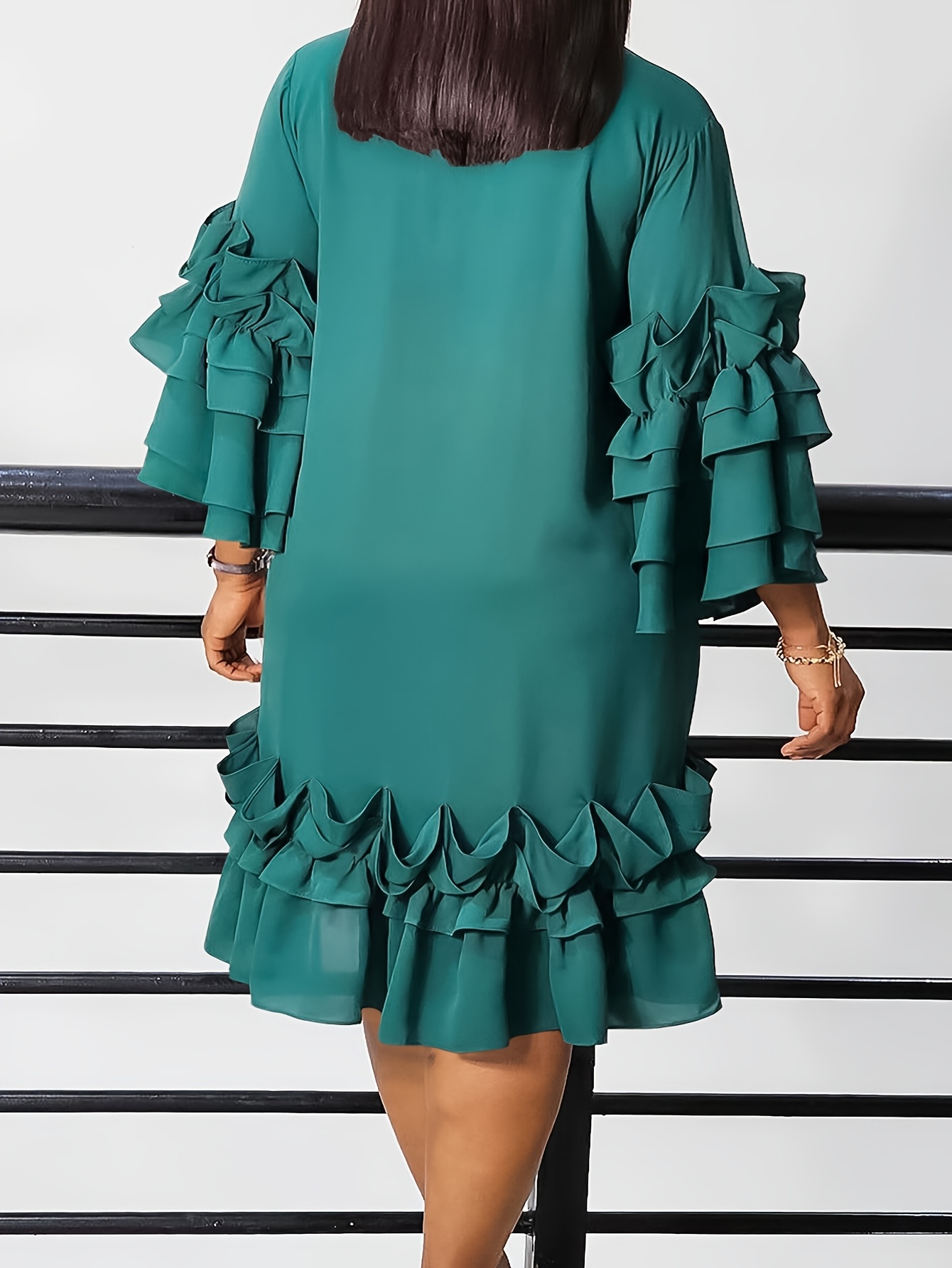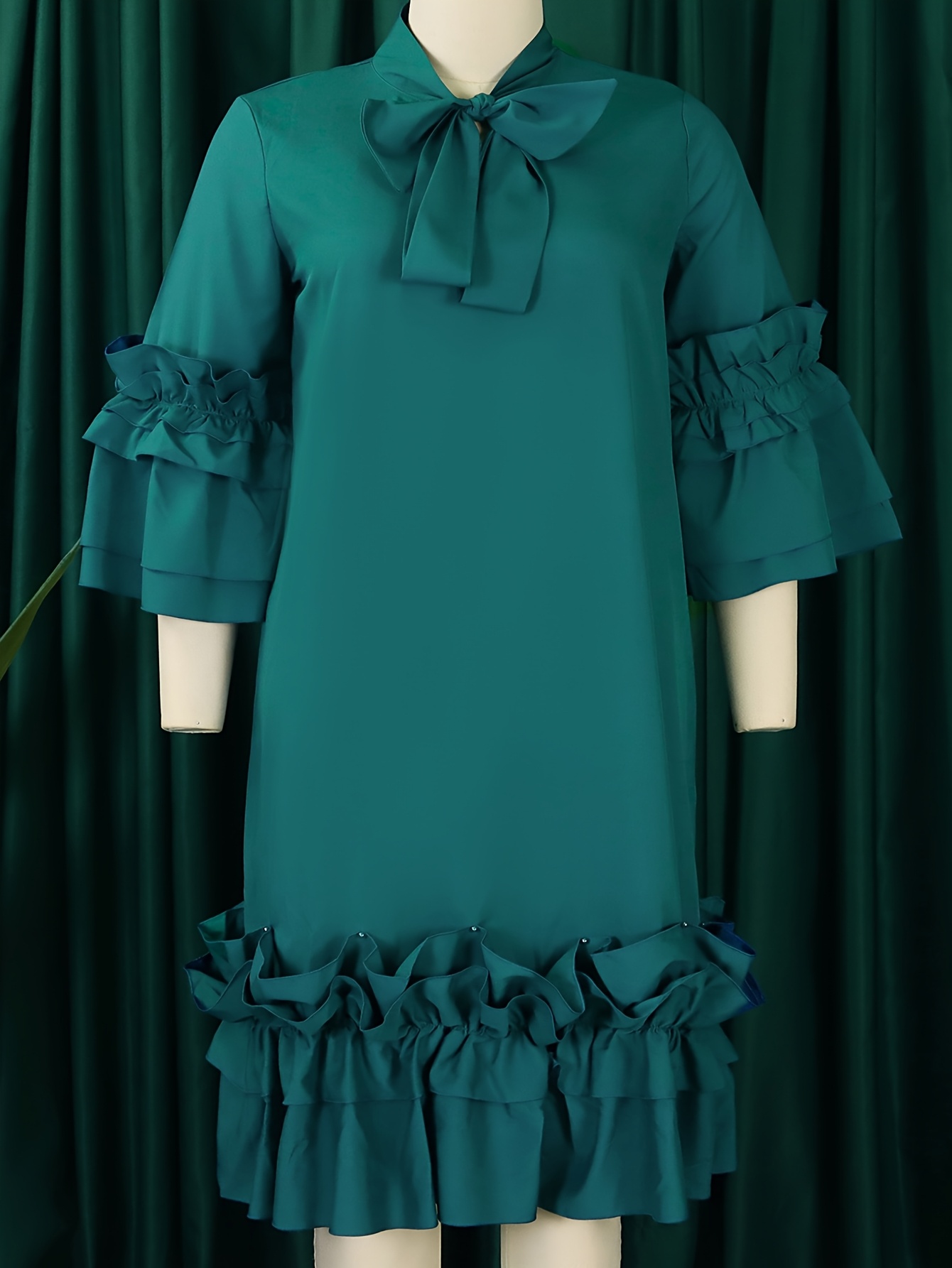 [New Arrival Plus Size Dress] Spring/Summer New Arrival - Elegant Plus Size Casual Chic Dress with Ruffled Bell Sleeves, Bow Detail, Stand Collar | Solid Color, Non-Stretch Fabric
