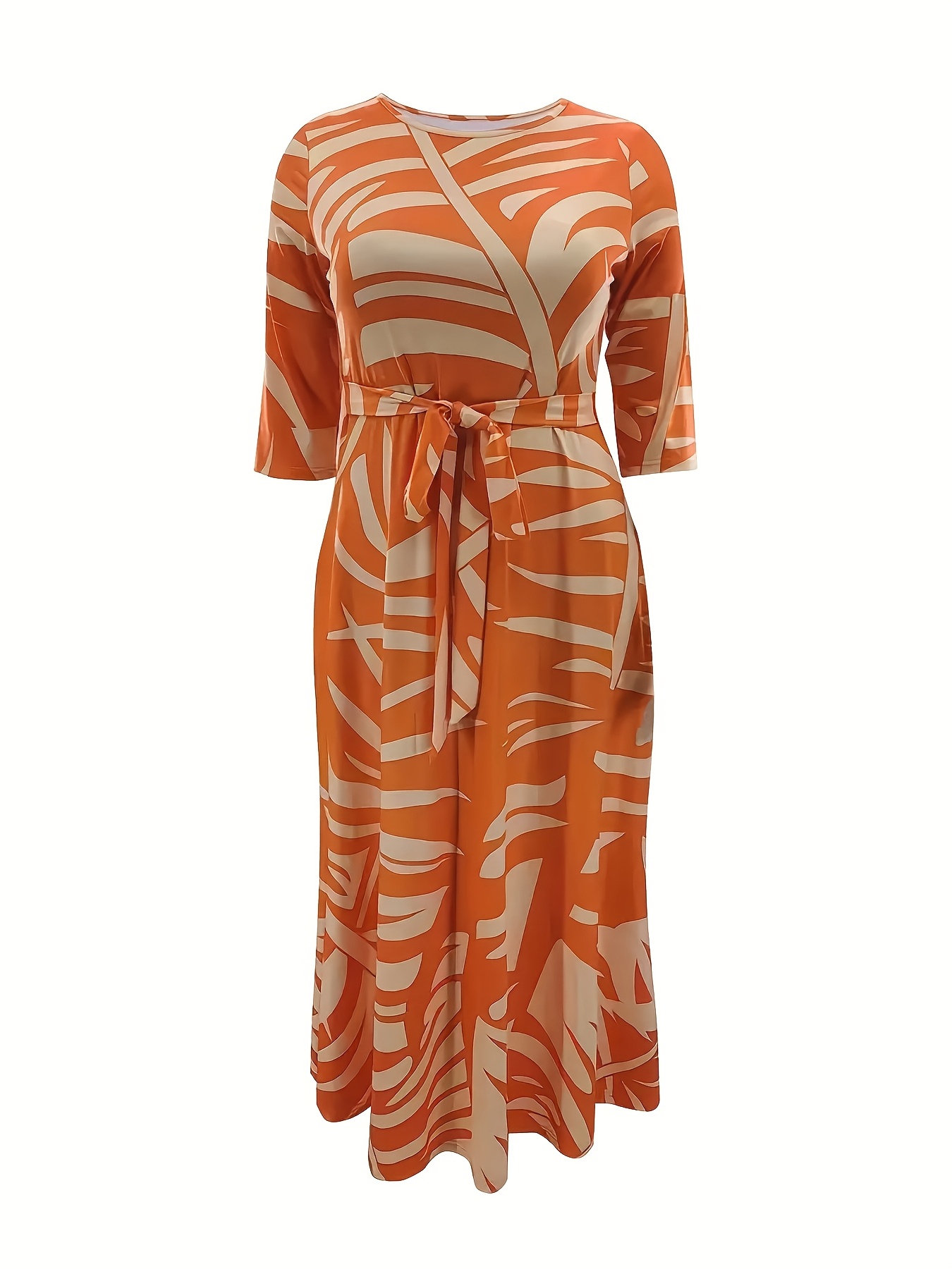 Tropical Print Maxi Dress for Women - Casual Crew Neck, 5-Point Sleeve with Tie Waist, Plus Size, Vibrant Orange & Yellow Leaf Pattern, All-Season Comfort