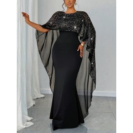 Plus Size, Women's Fashionable and Elegant Batwing Sleeve Mesh Splicing Plus Size Wrap Dress
