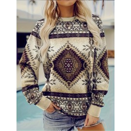 Plus Size - Women'S Bohemian Western Print Sweatshirt - Long Sleeve Round Neck Pullover with Tribal Pattern, All-Season Casual Comfort Fit, Oversized H-line Silhouette For Casual Attire, Bohemian Style, Comfortable Wear, Boho Lovers