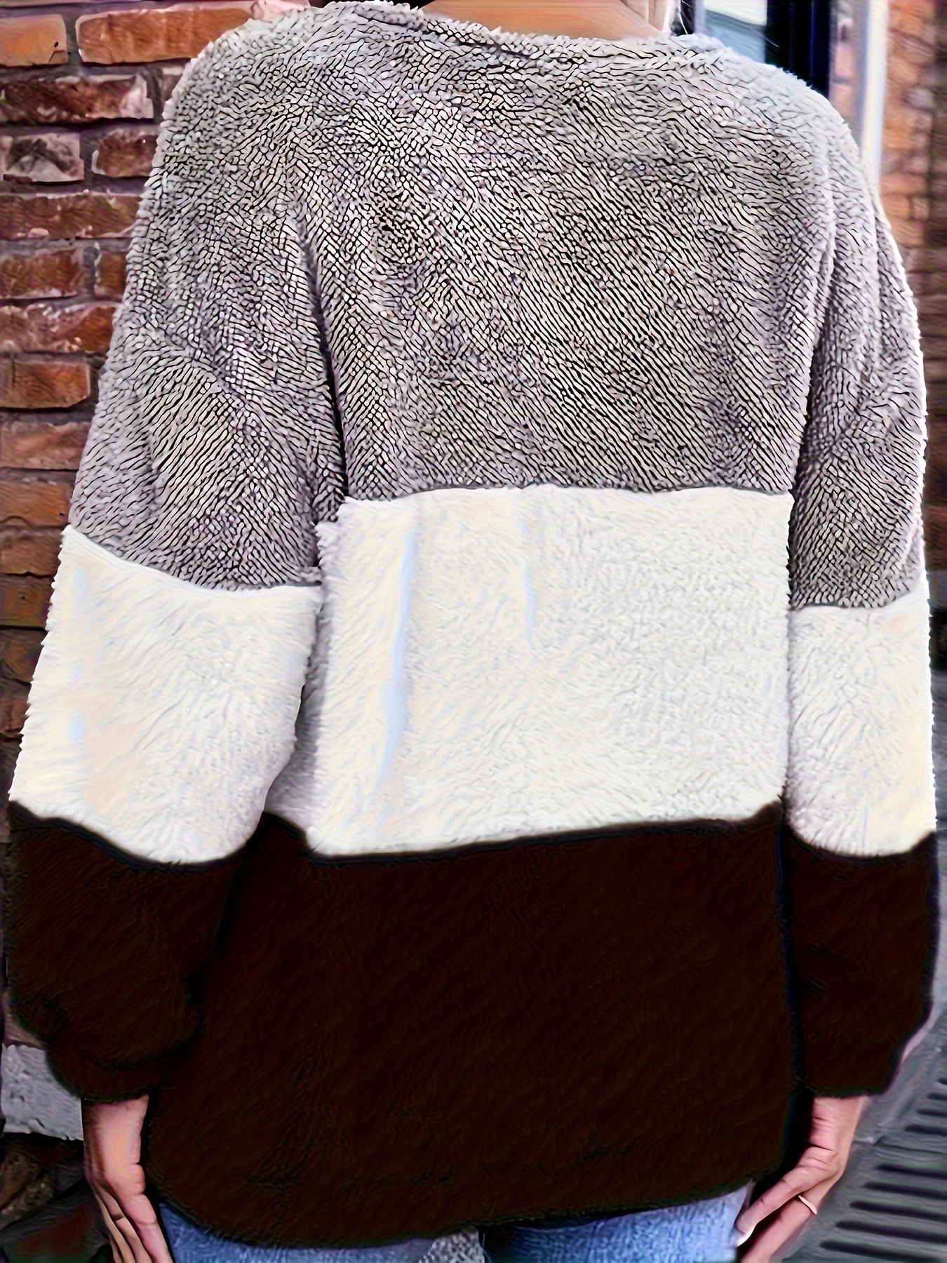 [Plus Size Fleece Hoodie] Cozy Plus Size Women's Plush Fleece Hoodie | Color Block Striped Loose Fit Pullover, Round Neck & Machine Washable | Casual Fall Winter Fashion Top, Comfortable Clothing, Nontransparent Material