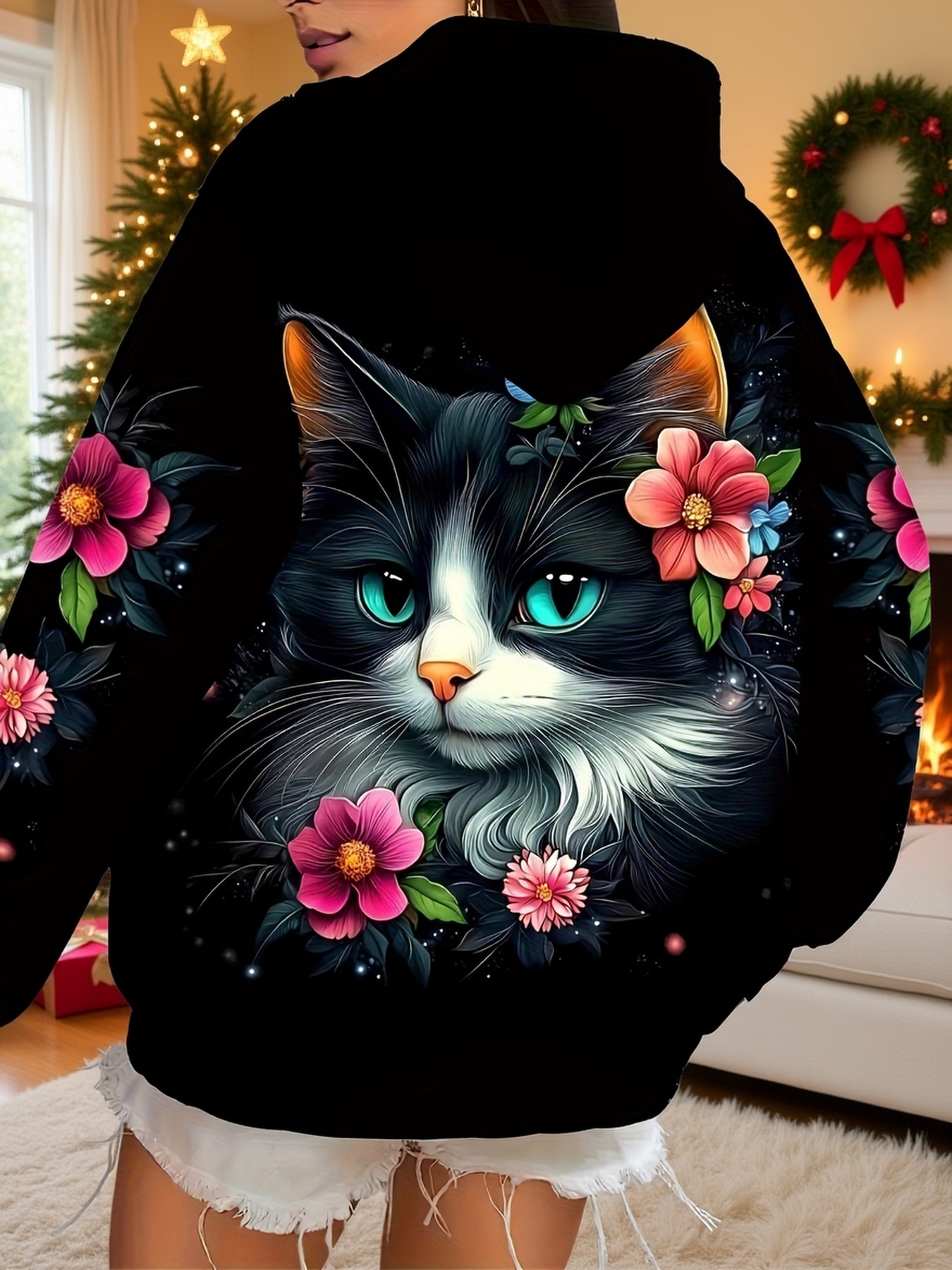 Plus Size - Women'S Plus Size Floral Cat Print Hoodie - Black Pullover Sweatshirt with Blue Eyes, Cozy Fall Winter Hooded Sweater for Everyday & Formal Outfits, Cute Cat Lover Gift, Casual Wear, Playful Design, Comfortable Fabric, Stylish Hooded Top, Fashion Enthusiasts, Cat Sqeatshirt, Curvy Sweatshirt For Women, Hoodie For Women Plus Size, Sweatshirt For Women, Pull For Women Plus Size, Pullover Women Large Size, Sweatshirt Women Large Size, Hoodie Women Large Size