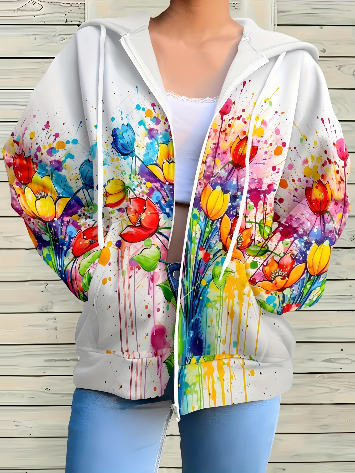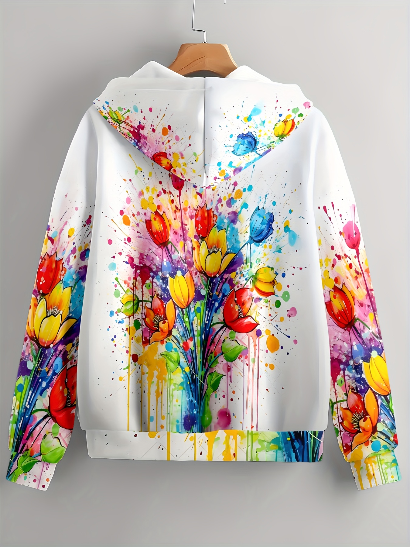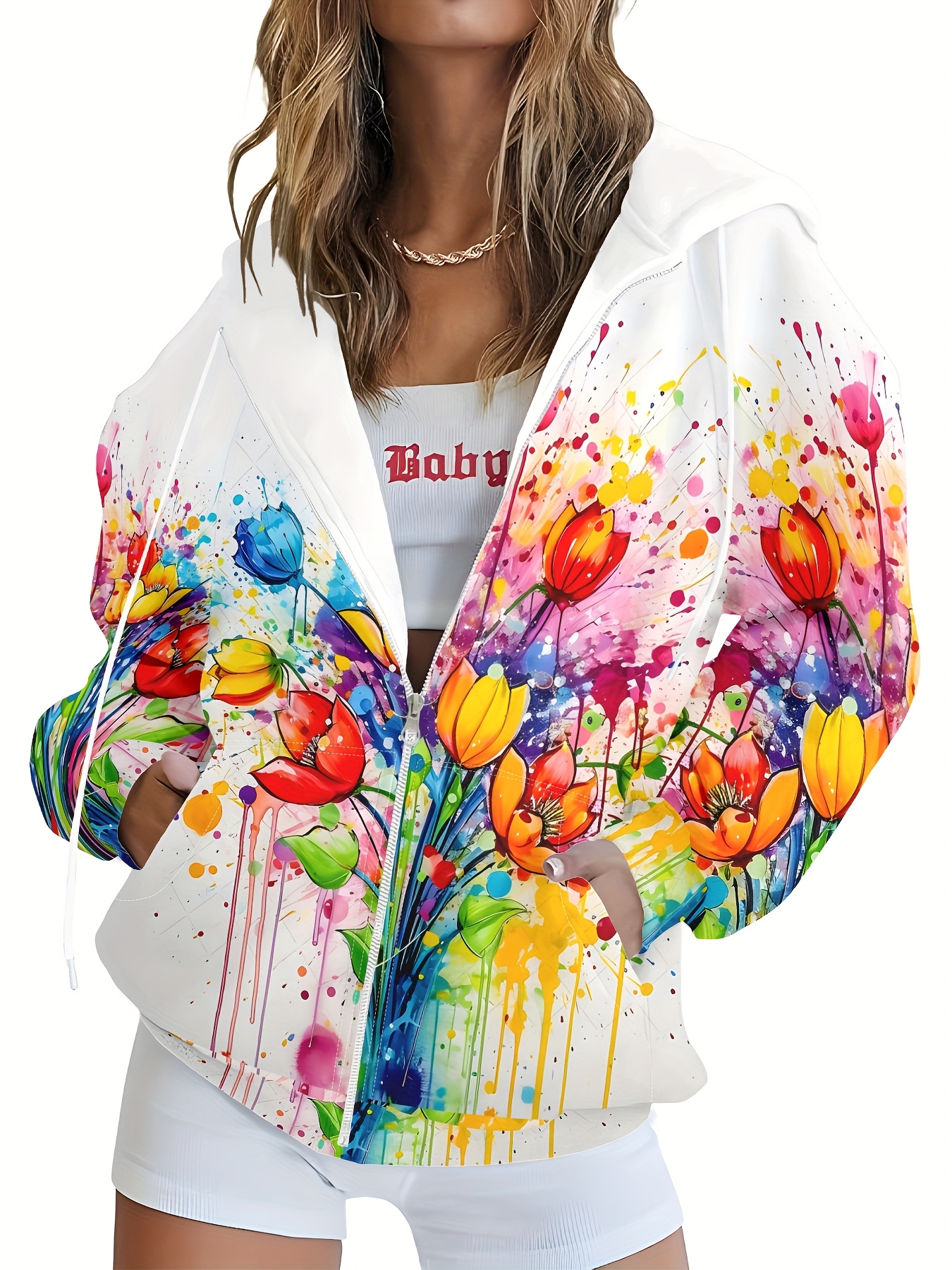 [Vibrant Hoodie] Vibrant Colorful Women's Casual Oil Paint Splatter Floral Print Zip-Up Hoodie | Relaxed Fit, Machine Washable, Autumn Winter Sweatshirt, Long Sleeve Design, Drawstring Hood