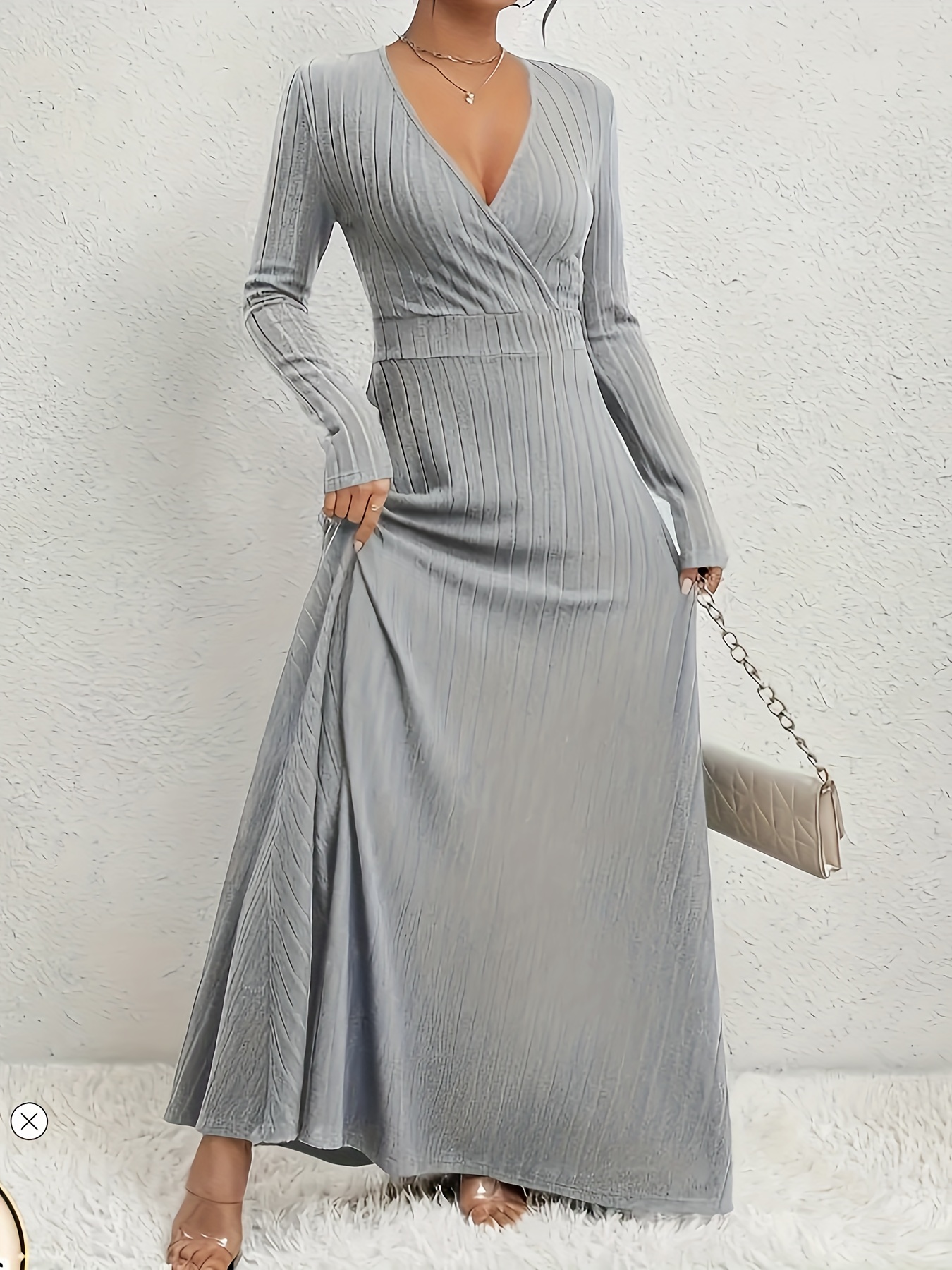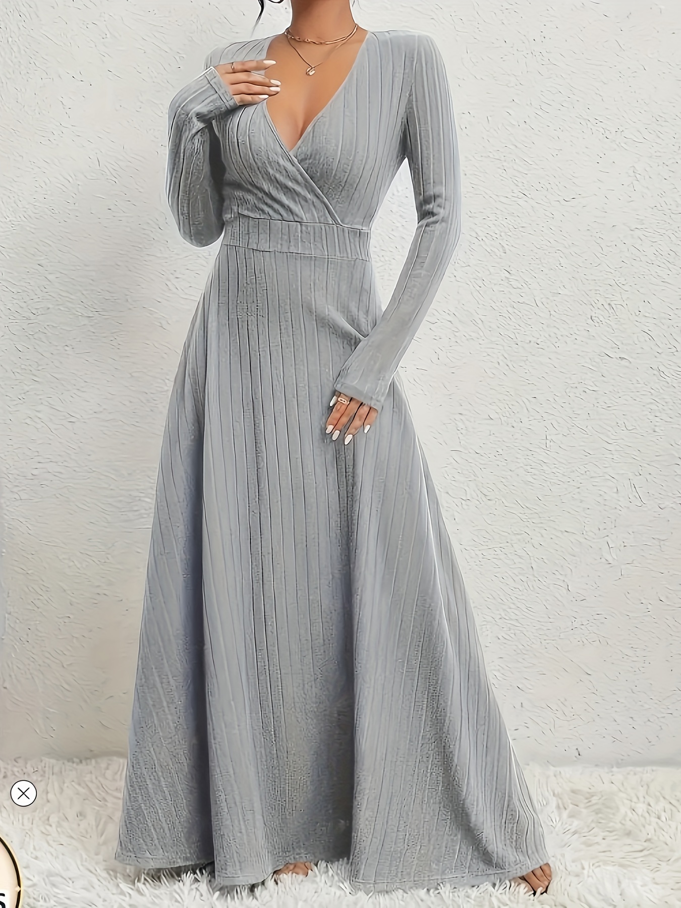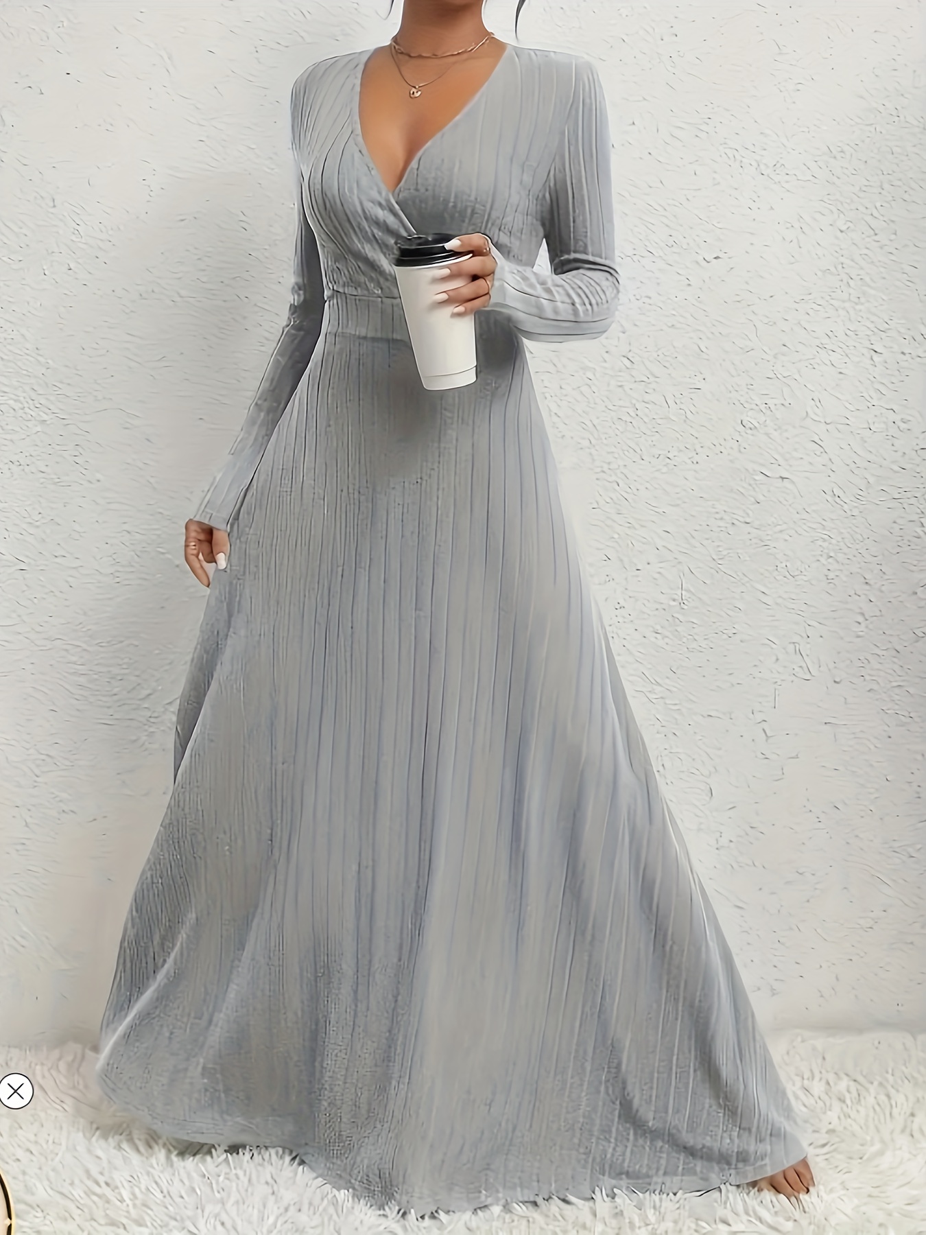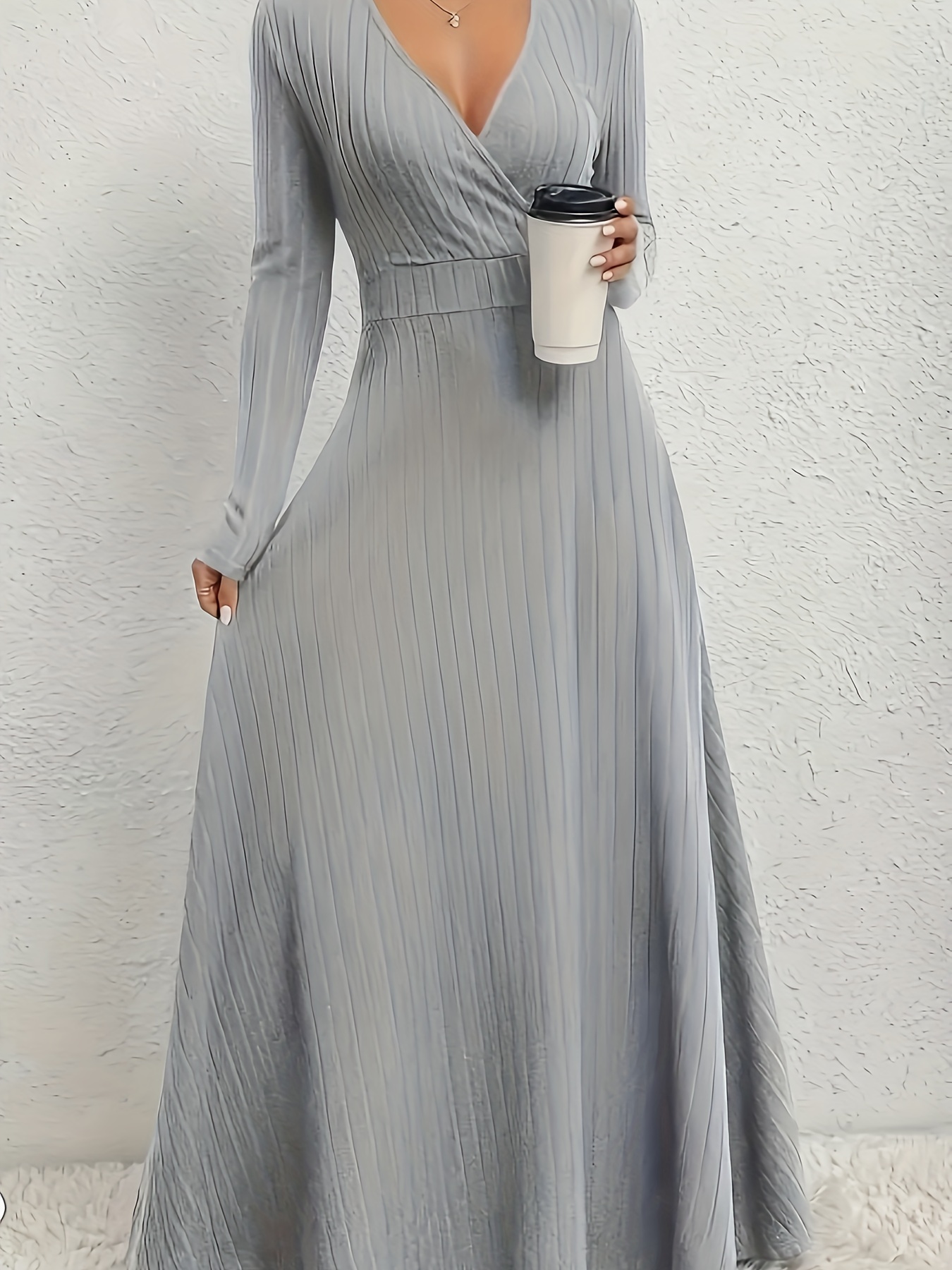 1pc Elegant Plus Size V-Neck Long Sleeve A-Line Dress - Polyester Knit Fabric, Solid Color, Cross Detail, Flared Hem, Pullover Style for Spring/Fall Casual Occasions