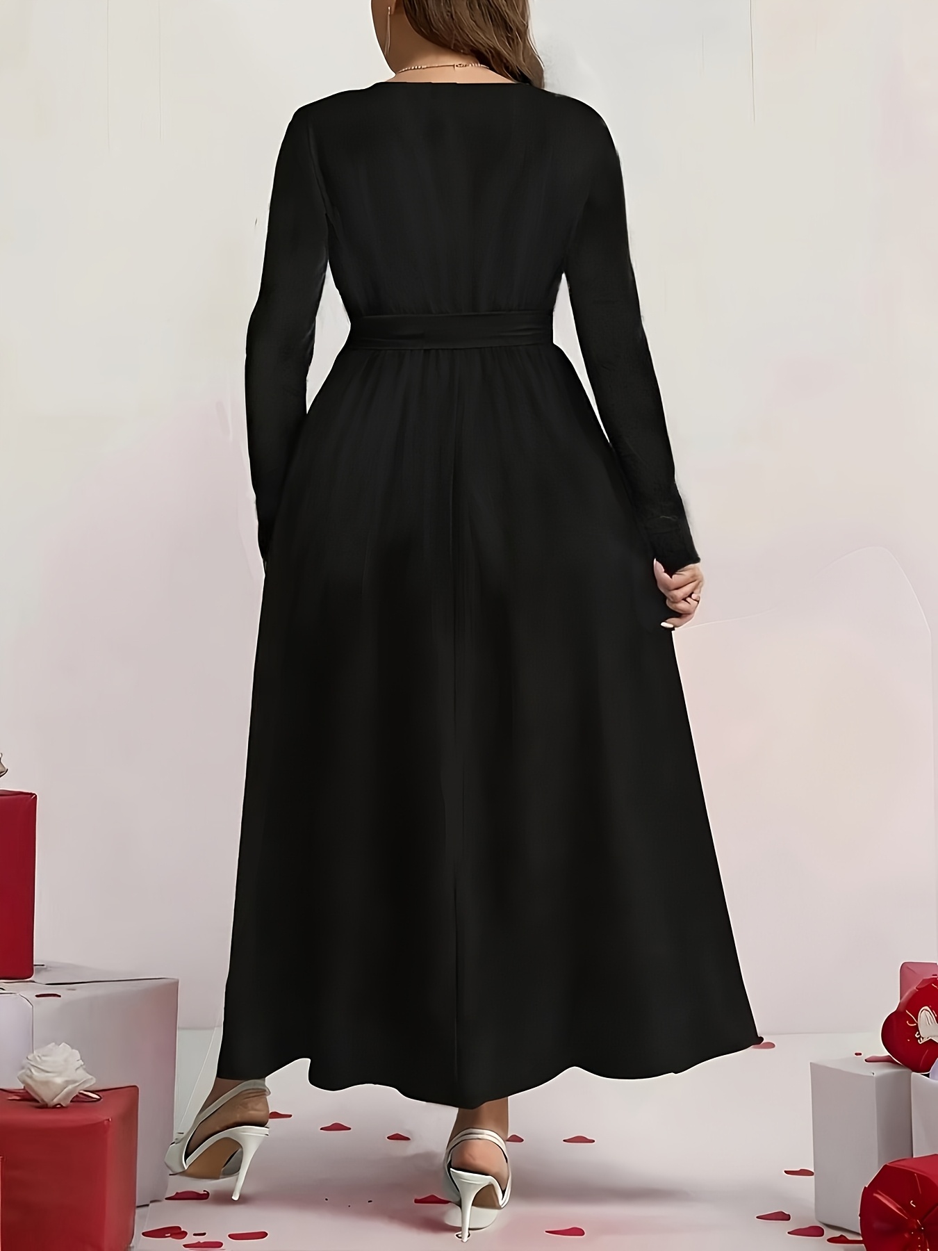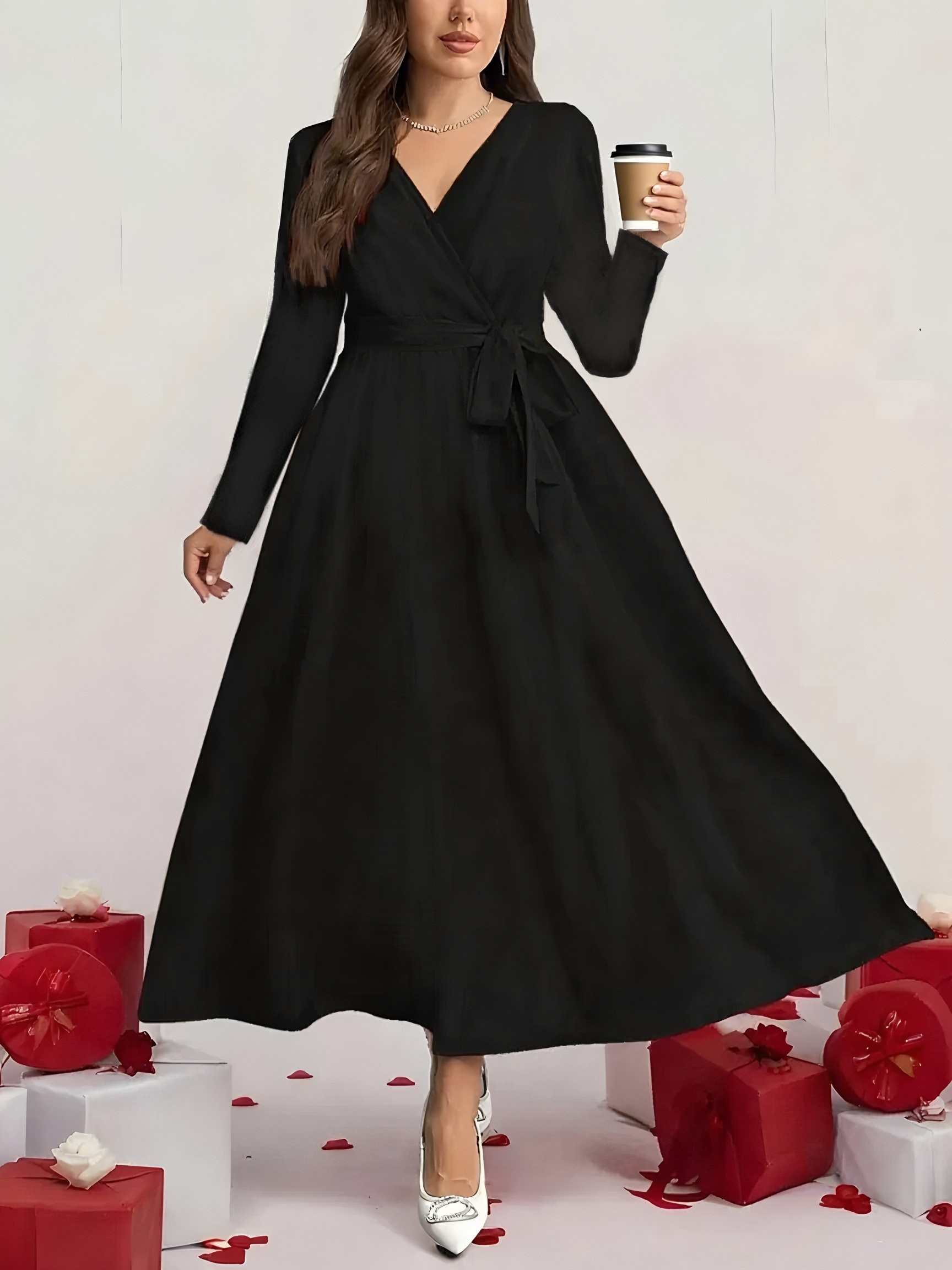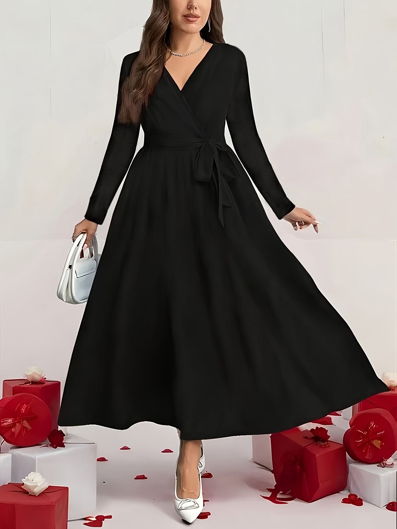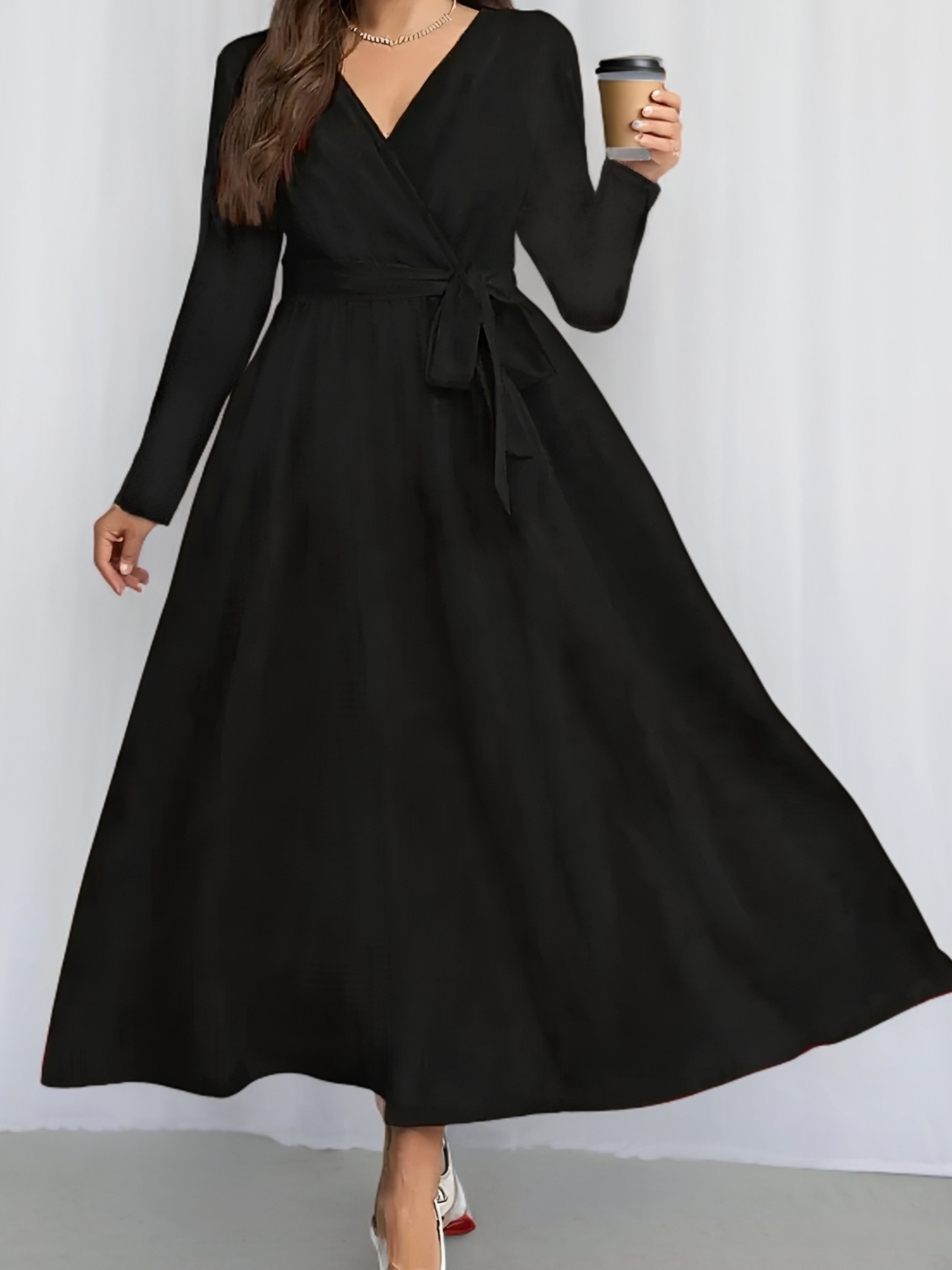 Plus Size, 's Elegant V-Neck Short-to-Medium Length (knee/ankle) A-Line Dress - Wrinkle-Free & Tie Waist, Short Sleeve-like-like Collar-like -like Design (No Bulk), All-Season Wear for Weddings, Parties, or Semi