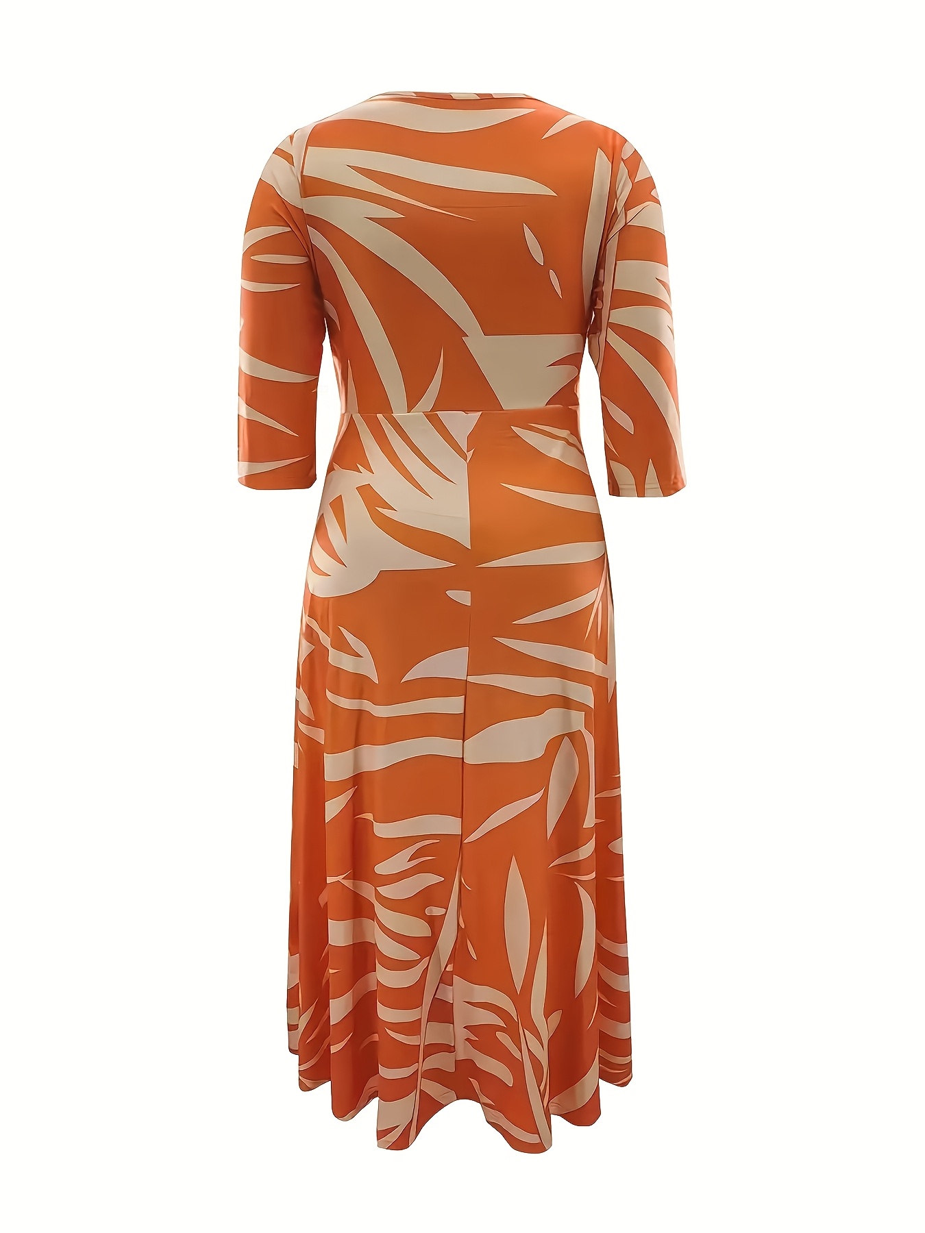 Tropical Print Maxi Dress for Women - Casual Crew Neck, 5-Point Sleeve with Tie Waist, Plus Size, Vibrant Orange & Yellow Leaf Pattern, All-Season Comfort