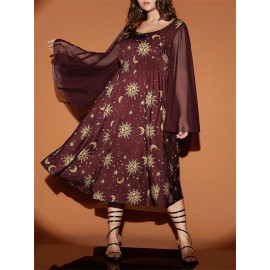 Women's Halloween Flowy Dress Elegant Long Sleeve Scoop Neck Sun Moon Print Pocket Dress Midi Dress