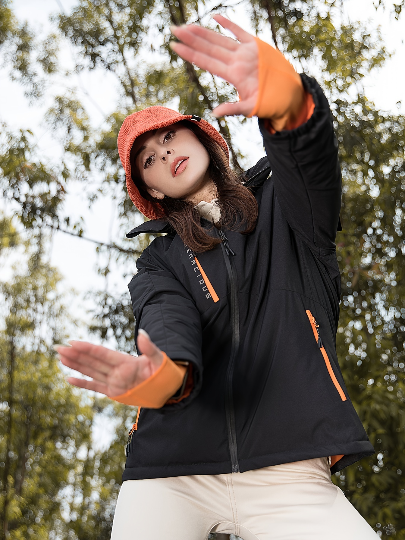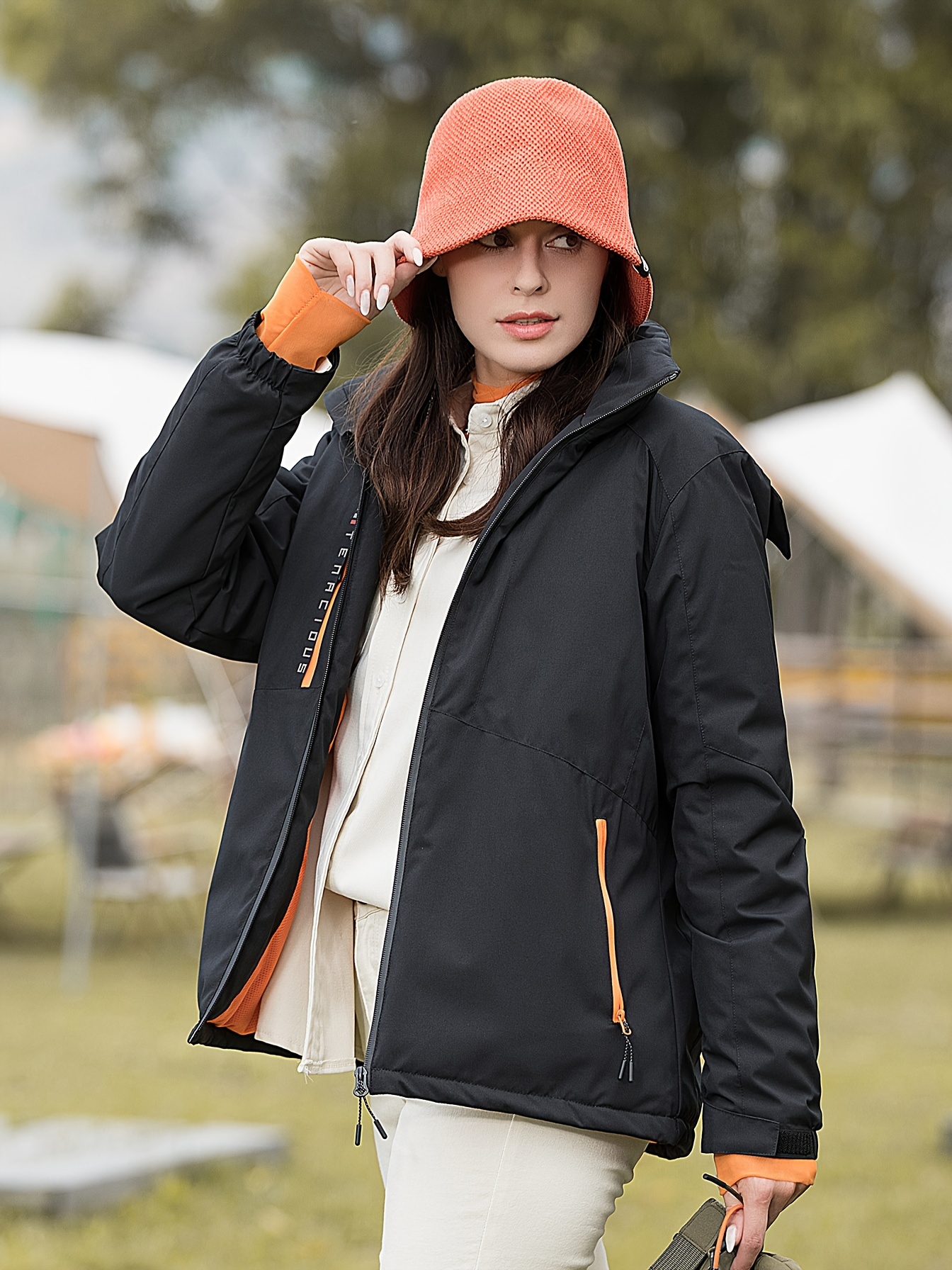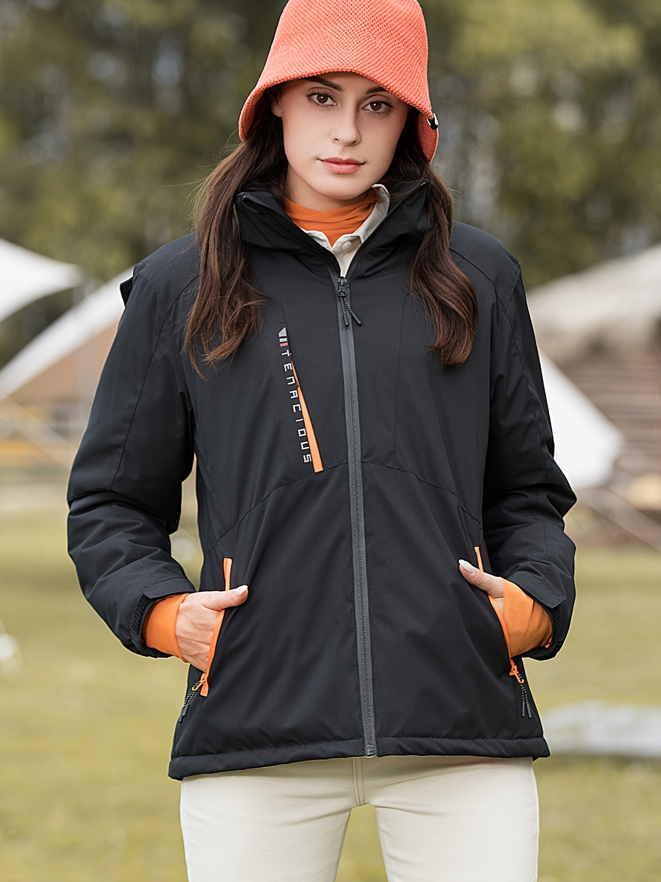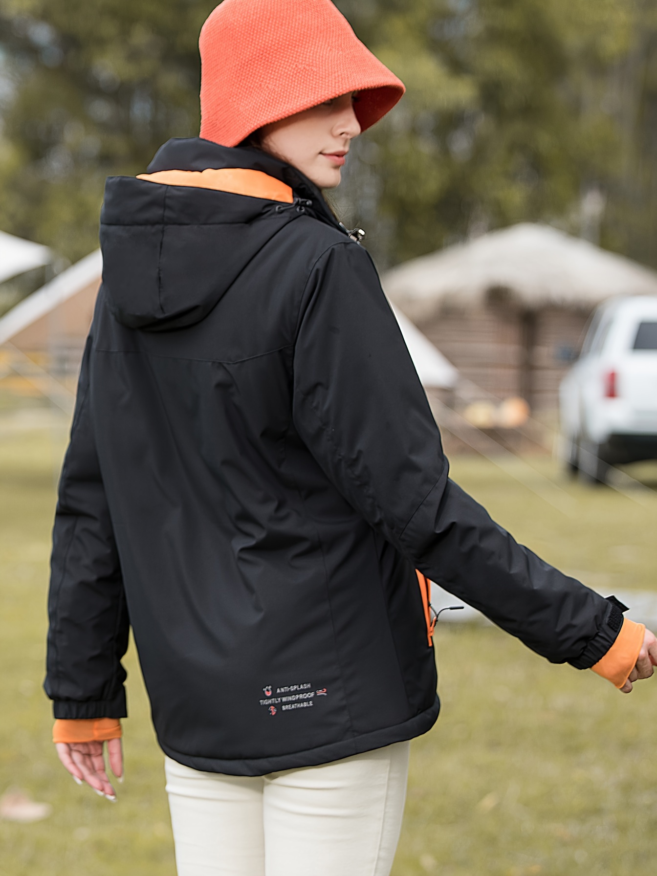 1pc Women'S Windproof Water-Resistant Breathable Casual Outdoor Sports Jacket, 100% Polyester Hooded Thickened Climbing Coat, Long Sleeve Winter Sports Apparel with Zipper and Alphabet Pattern