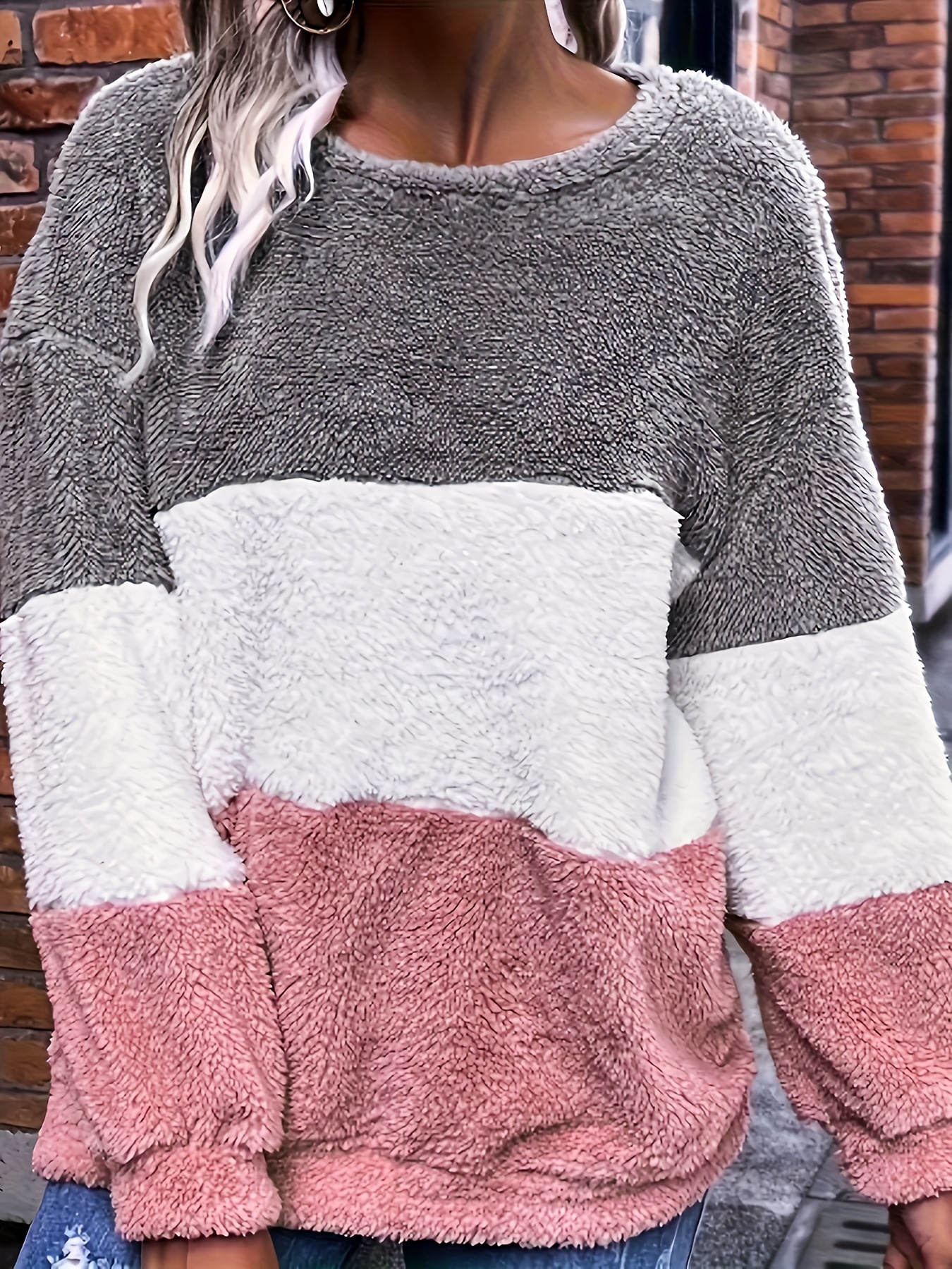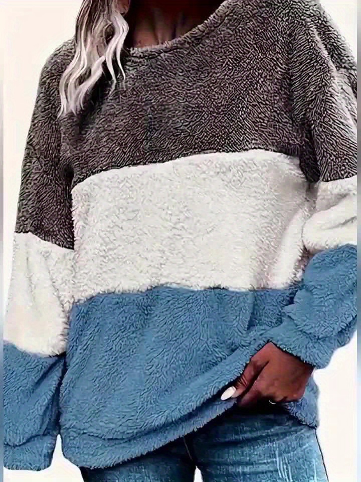 [Plus Size Fleece Hoodie] Cozy Plus Size Women's Plush Fleece Hoodie | Color Block Striped Loose Fit Pullover, Round Neck & Machine Washable | Casual Fall Winter Fashion Top, Comfortable Clothing, Nontransparent Material