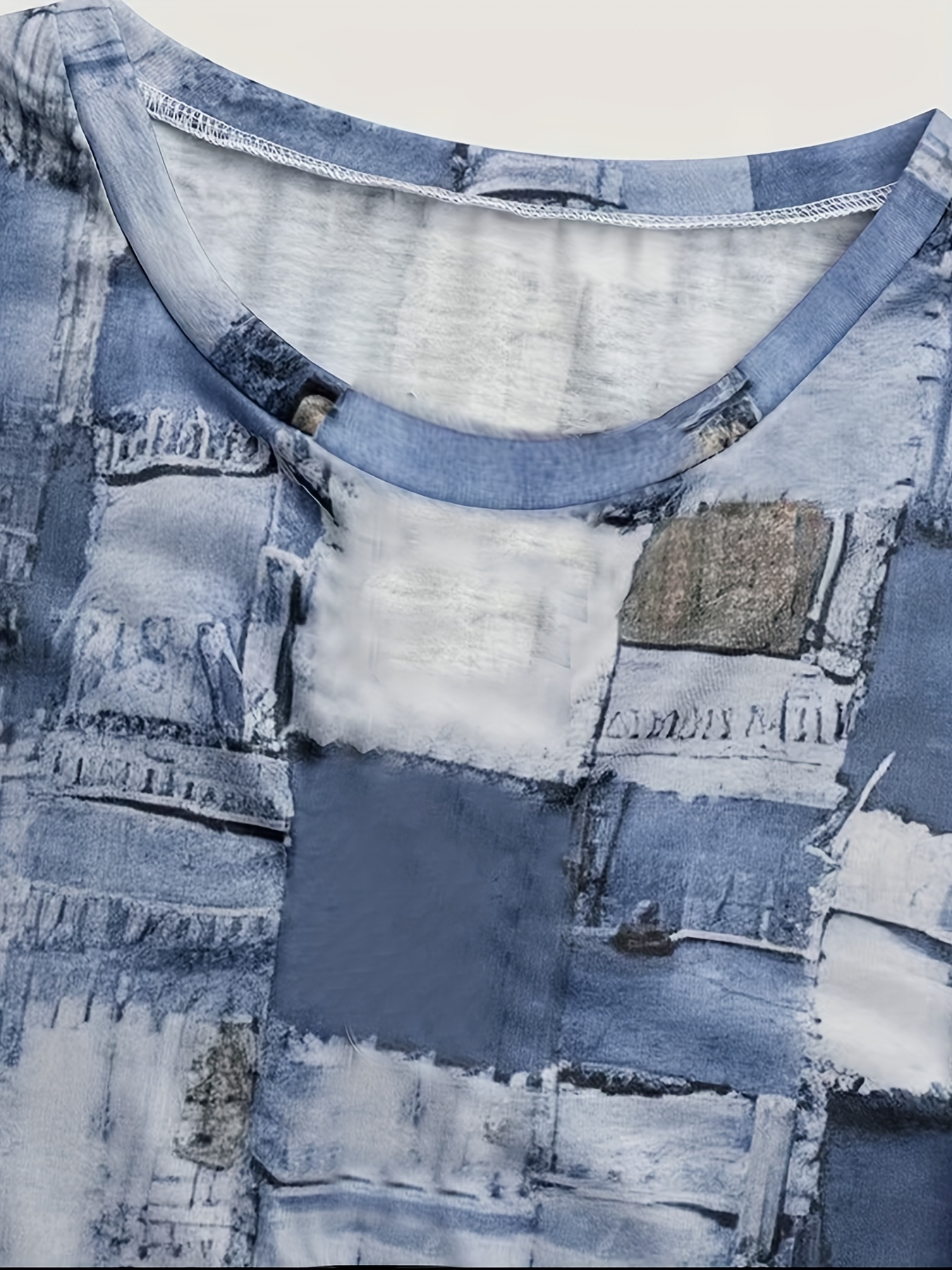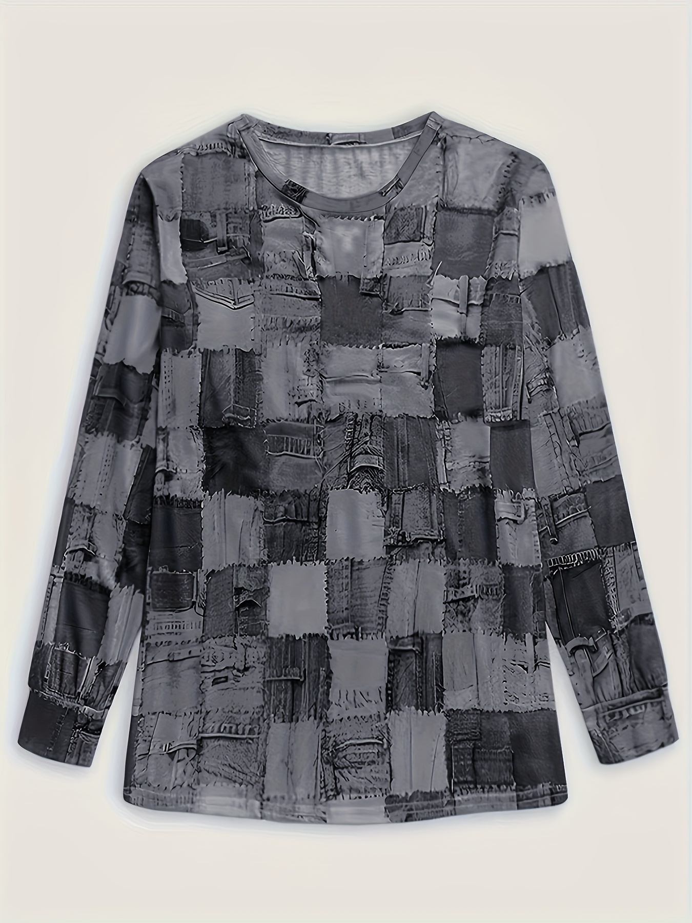 Plus Size, [Denim Print/Imitation Denim] Plus Size Women's Casual Imitation Denim Print Long Sleeve Top - Blue & White Grid Pattern with Golden Accents, Medium Stretch Round Neck, Contrast Cuffs, Autumn/Winter Versatile Layering Piece, Denim Top, Layering Fashion, Soft Texture Fabric