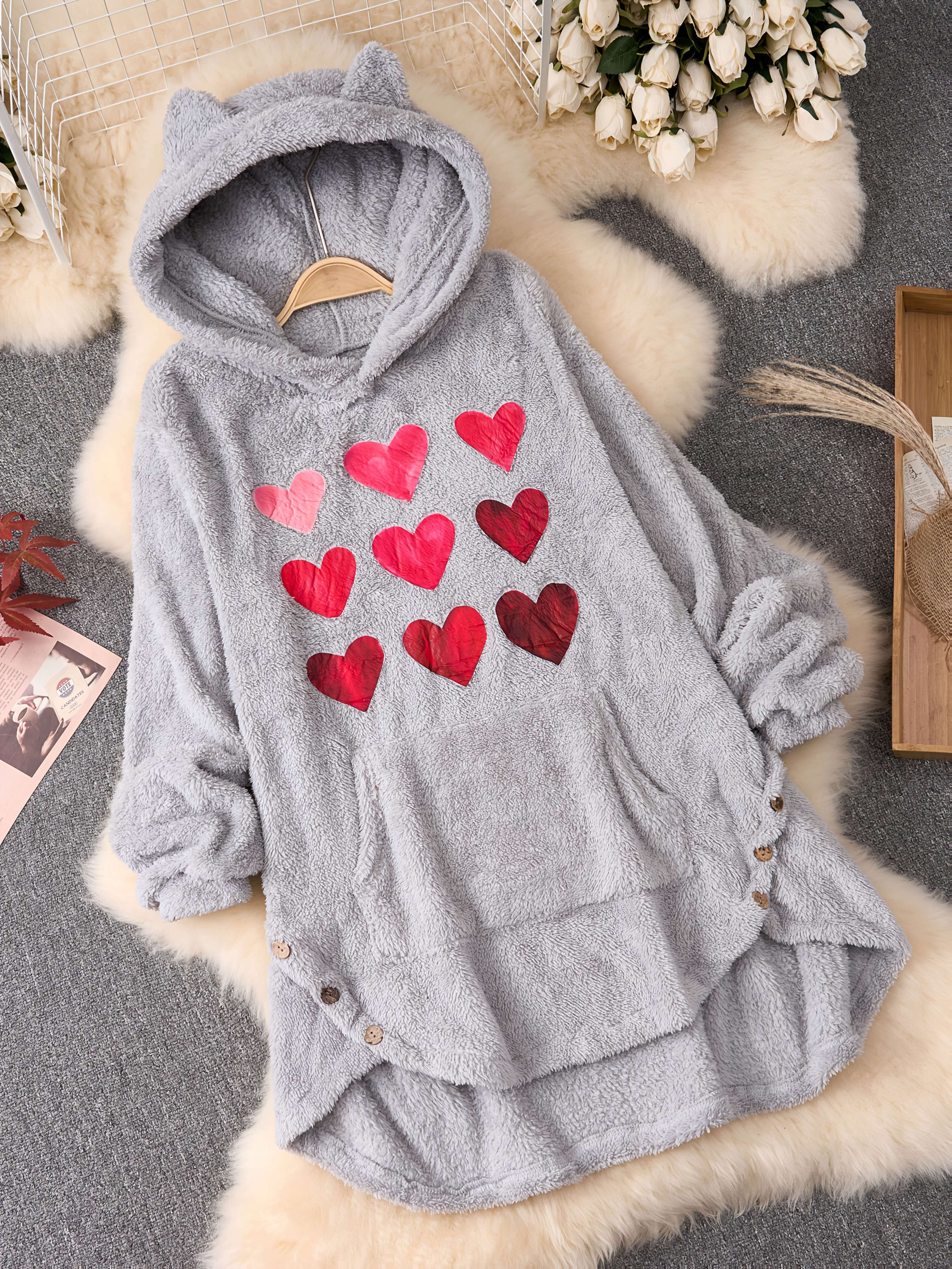 Plus Size, Women's Plus Size Oversized Valentine's Day Heart Print Hooded Sweatshirt - Grey with Pink & Red Hearts, Cozy Casual Pullover with Pockets, Machine Washable Winter Fall Hooded Sweatshirt for Valentine's Outfits
