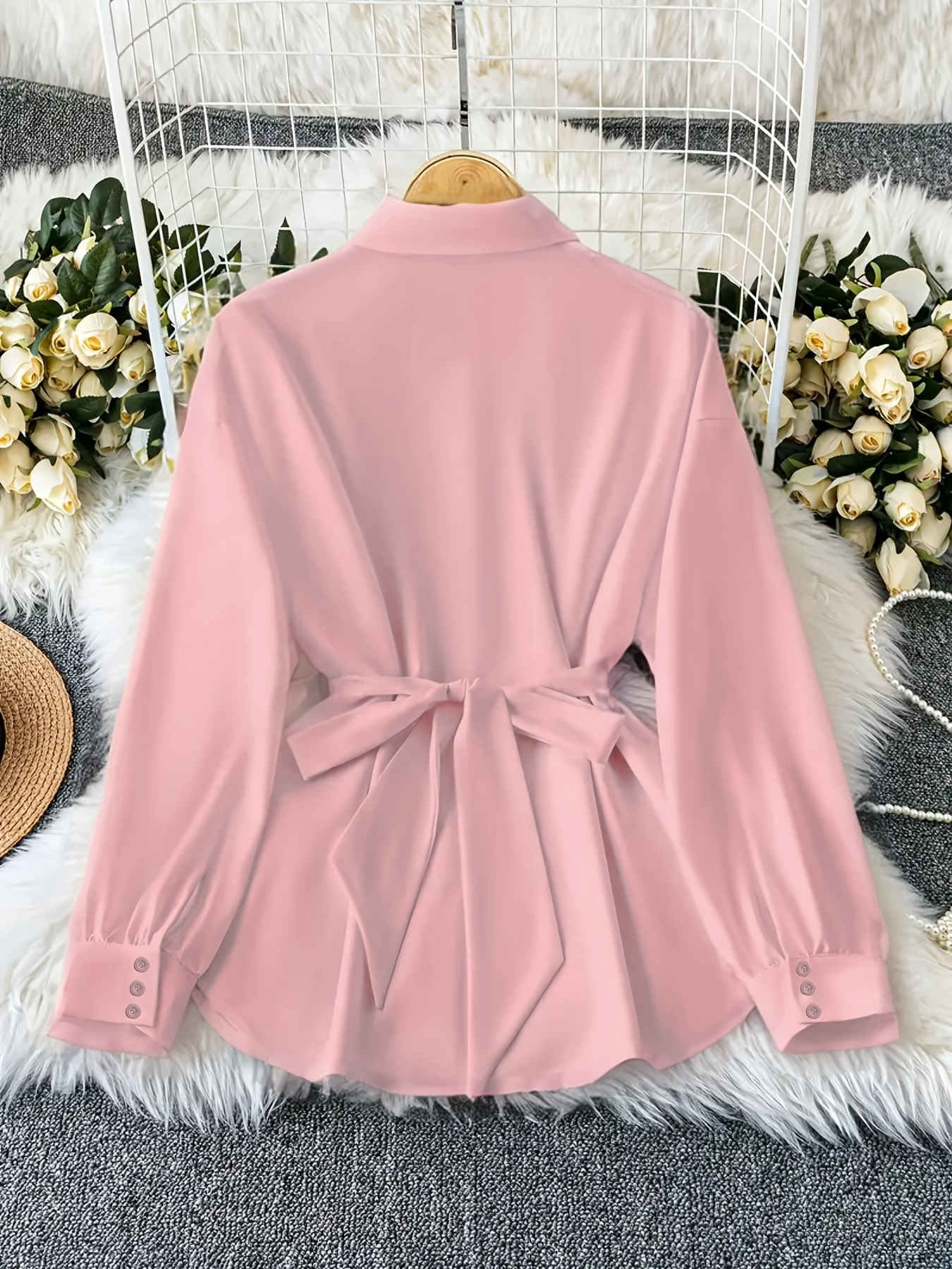 Plus Size, Women's Elegant Blouse Shirt - Long Sleeve Button-up top with Belt Accent, Non-Stretchy Fabric for Formal & Everyday Outfits - Office, Party, Casual Chic Outfits - Machine Washable Women's Clothing, Office Attire, Classic Collar, Polished Look, Stylish Top, Professional Women